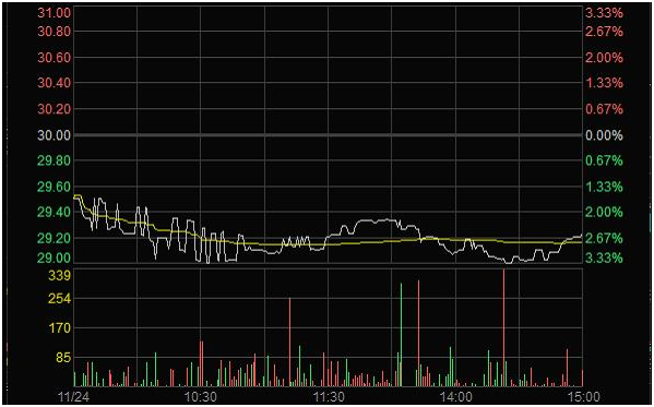 2011年11月23日臨近收盤期間(14:56:24至14:59:28),任某某為了在短期內(nèi)拉升股價(jià),大量申報(bào)買入“X”4筆共計(jì)63,000股,占尾市階段市場(chǎng)申買量的比例高達(dá)75.54%;委托價(jià)格由29.60元升至32.00元,每筆均高于當(dāng)時(shí)市場(chǎng)上的買1檔價(jià)格,三分鐘內(nèi)將股價(jià)由29.35元拉升至30元收盤,拉升幅度達(dá)2.21%。(見下圖)