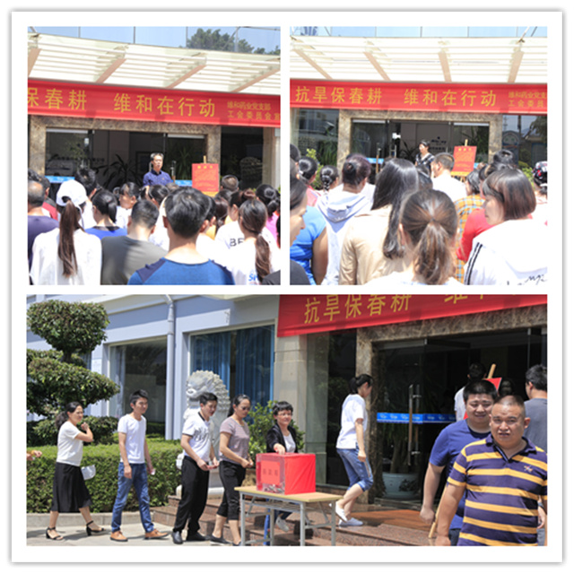 今年以來(lái),由于紅塔區(qū)降水持續(xù)偏少,部分地方已嚴(yán)重干旱,給人畜飲水安全和春耕生產(chǎn)帶來(lái)了較大影響。為積極響應(yīng)政府號(hào)召,并鼓勵(lì)和增強(qiáng)旱區(qū)群眾抗旱保春耕的信心與決心,同時(shí)體現(xiàn)我們維和人的社會(huì)責(zé)任,在維和藥業(yè)黨支部和工會(huì)委員會(huì)的共同倡議下,于2019年5月16日中午11時(shí),分別在公司蓮池廠區(qū)和高新廠區(qū)同時(shí)進(jìn)行主題為“抗旱保春耕,維和在行動(dòng)”募捐儀式。