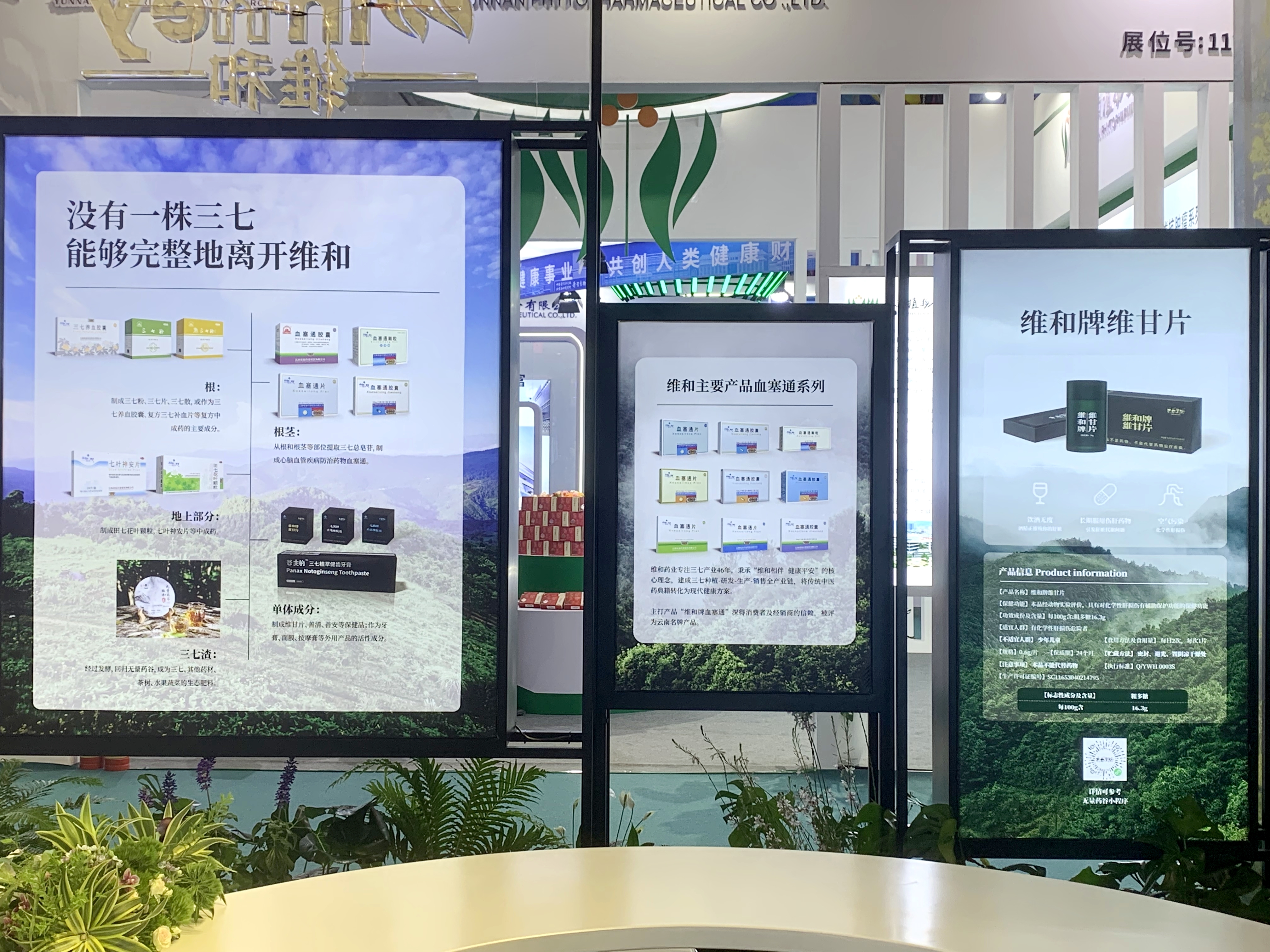 在產(chǎn)品展示區(qū),我們創(chuàng)新地將展架與三七植株、綠植和維和的產(chǎn)品巧妙融合,讓每一件產(chǎn)品都仿佛生長于自然之中,增加了展品展示的生動性。